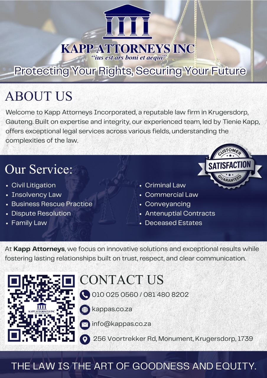 A reputable law firm based in Krugersdorp, Gauteng.