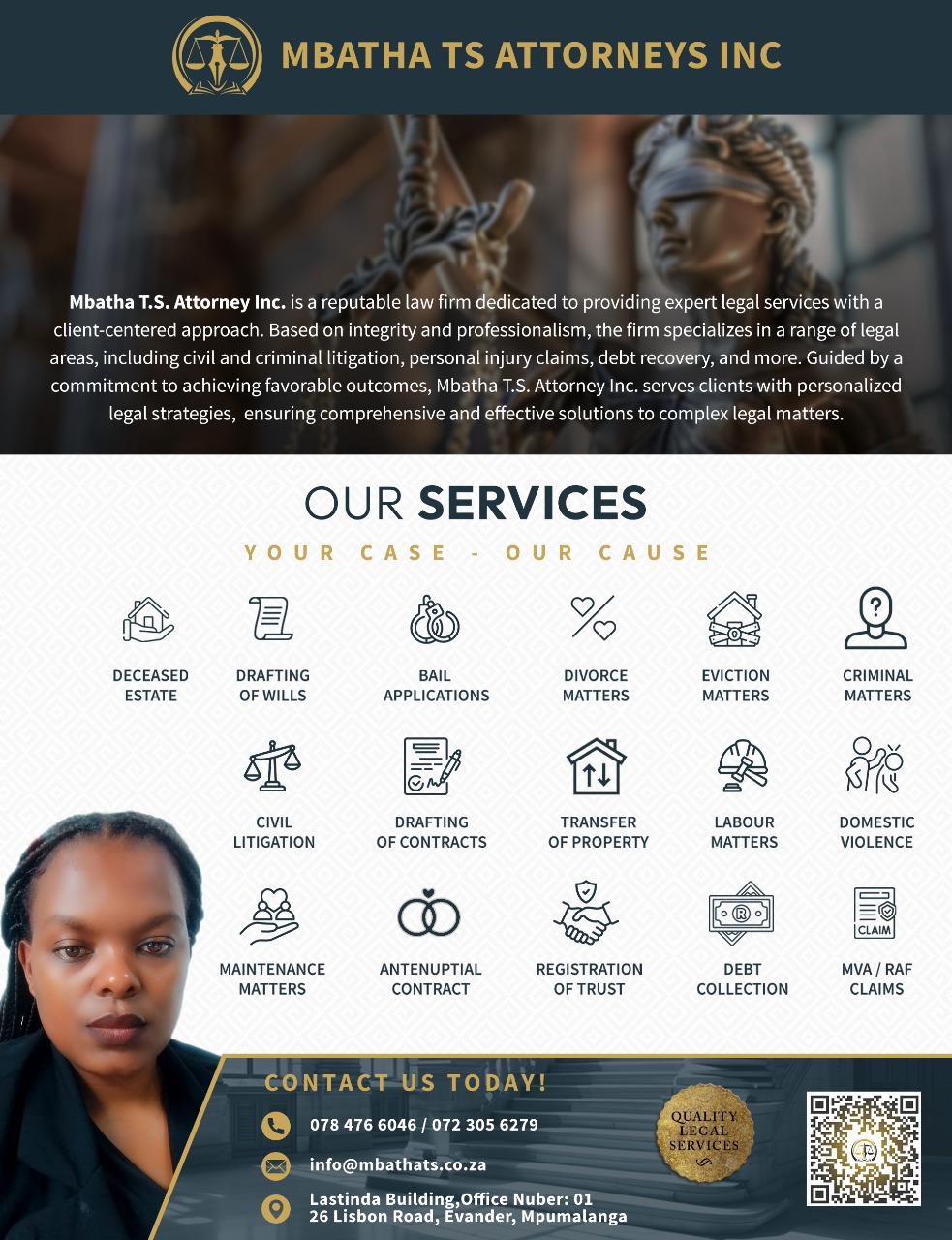 Founded on the principles of integrity, professionalism, and accessibility, Mbatha Ts Attorneys INC aims to bridge the gap between quality legal services and affordability. Our mission is to empower our clients with knowledge, guidance, and representation, ensuring their rights are protected and interests advanced.
