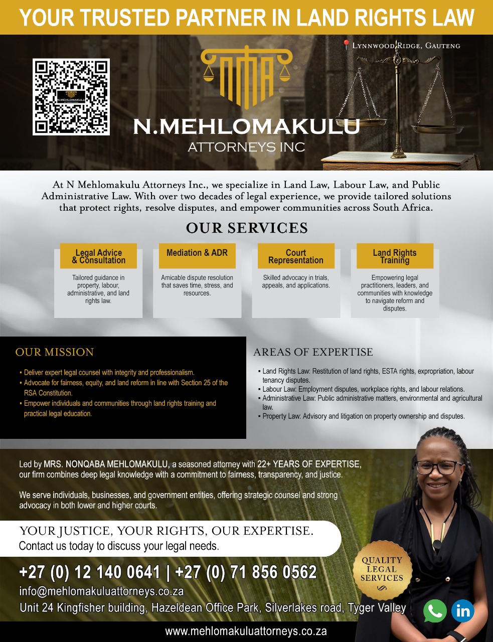 Our team is led by Mrs. Nonqaba Mehlomakulu, a seasoned attorney with over 22 years of experience in property, labour, and administrative law.