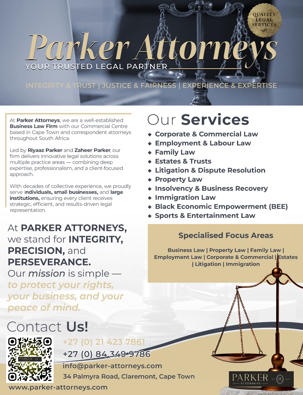 Our team, led by Riyaaz Parker and Zaheer Parker, offers a wide range of services, including Corporate and Commercial Law, Employment Law, Family Law, Estates and Trust, Litigation and Alternate Dispute Resolution, Property Law, Insolvency Law, Immigration Law, and Sports and Entertainment Law.
