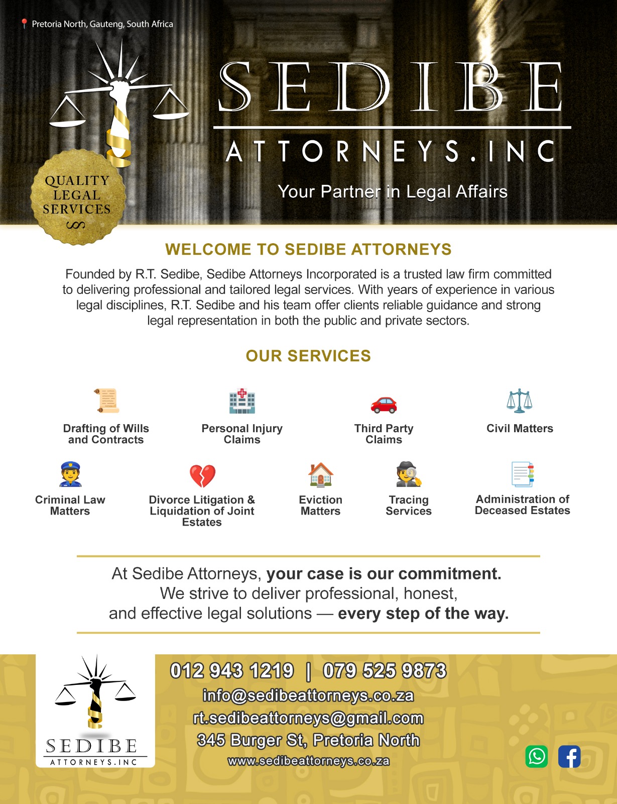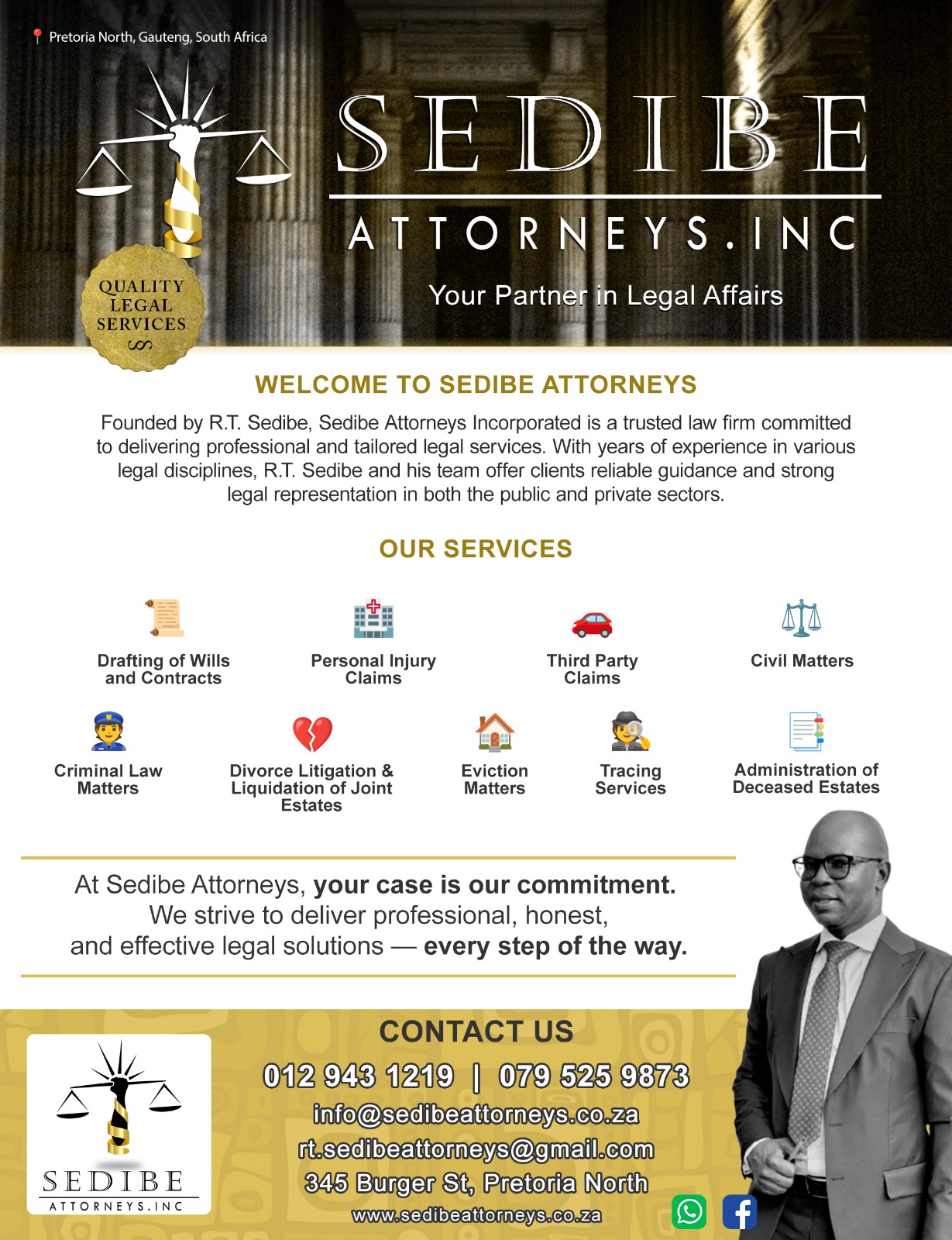 R.T. Sedibe is committed to providing quality legal services to both the public and private sectors. With his expertise and experience, he strives to deliver the best possible outcomes for his clients.