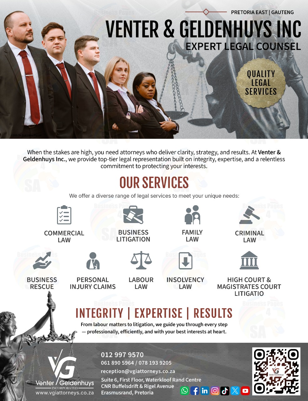 Delivering expert counsel in commercial law, family law, criminal law, labour law, litigation, business rescue and comprehensive legal solutions.